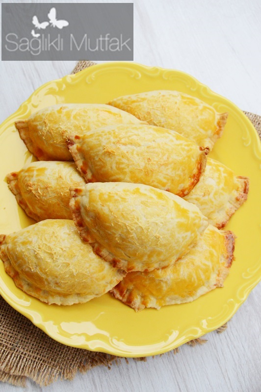 *Dinlenen hamuru çay tabağından biraz büyük açın. Malzemeyi ortasına koyup yarım ay şekilde kapatınve bir su bardağı ile yarım ay şeklinde kesin. Ben özel bir kalıp kullandım bu şekiller için.