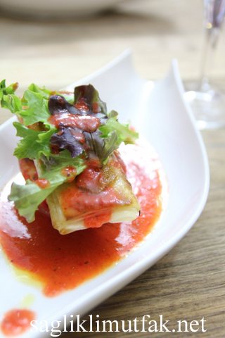 Nar Ekşili Şeftali, Baklava Yufkasında Hellim Peyniri ve Çilek Dressing