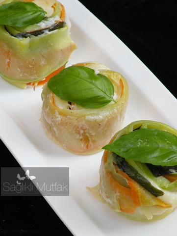 Haşlanan sebzeler süzülür. Kesme tahtasına sırala kabak, havuç, kabak, havuç iki yaprak fesleğen ve uygun incelikte kesilmiş, iki parça hellim peyniri konularak rulo şeklinde çok sıkmadan sarılır ve az yağlanmış muffin tepsisine yerleştirilir.