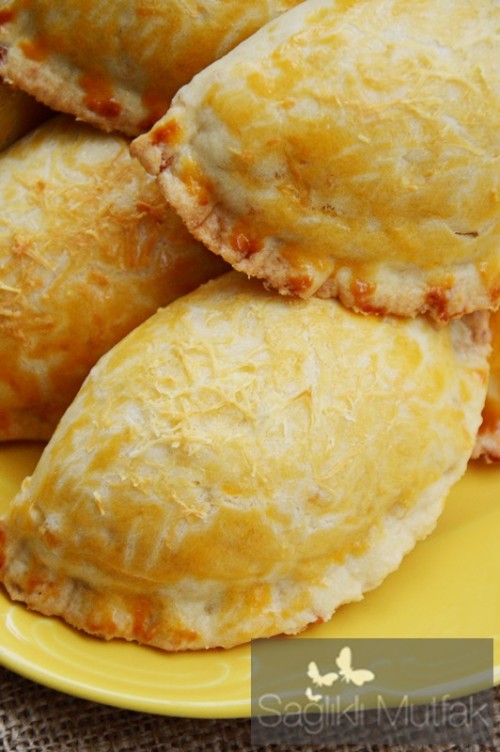 *Dinlenen hamuru çay tabağından biraz büyük açın. Malzemeyi ortasına koyup yarım ay şekilde kapatınve bir su bardağı ile yarım ay şeklinde kesin. Ben özel bir kalıp kullandım bu şekiller için.