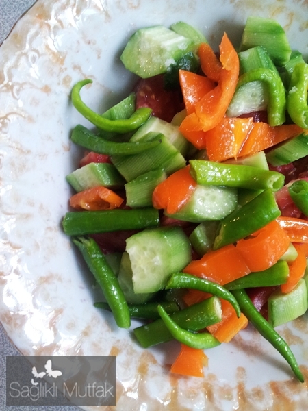 Merhaba herkese. Bugün menü de, gerek akşam sofralarına gerekse sabah kahvaltılarına hazırlayacağınız salatamız var. Eğer balkonunuzda domates, salatalık ve biber yetiştirme şansınız varsa çok şanslısınız demektir. Ama benim gibi kocaman bir bahçeniz olduğu halde, etraftaki 35 kedi yüzünden hiç birşey...